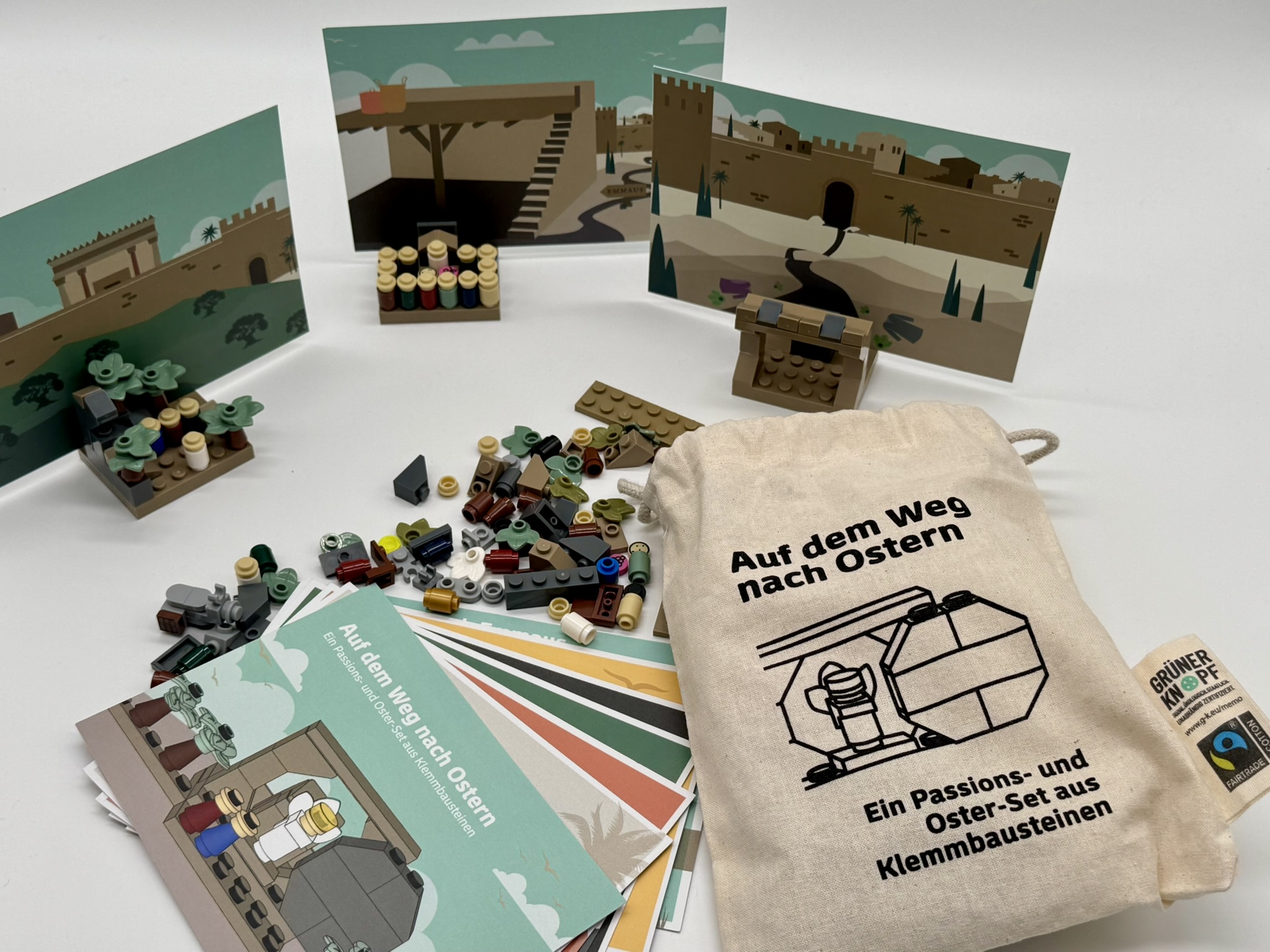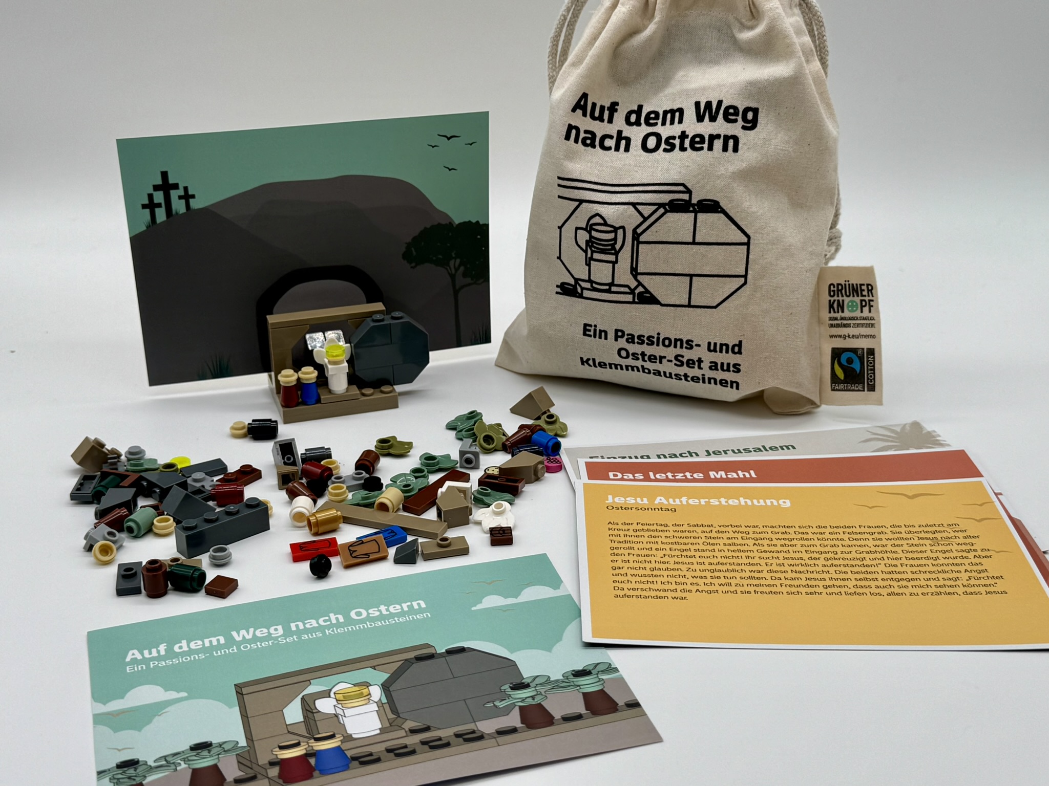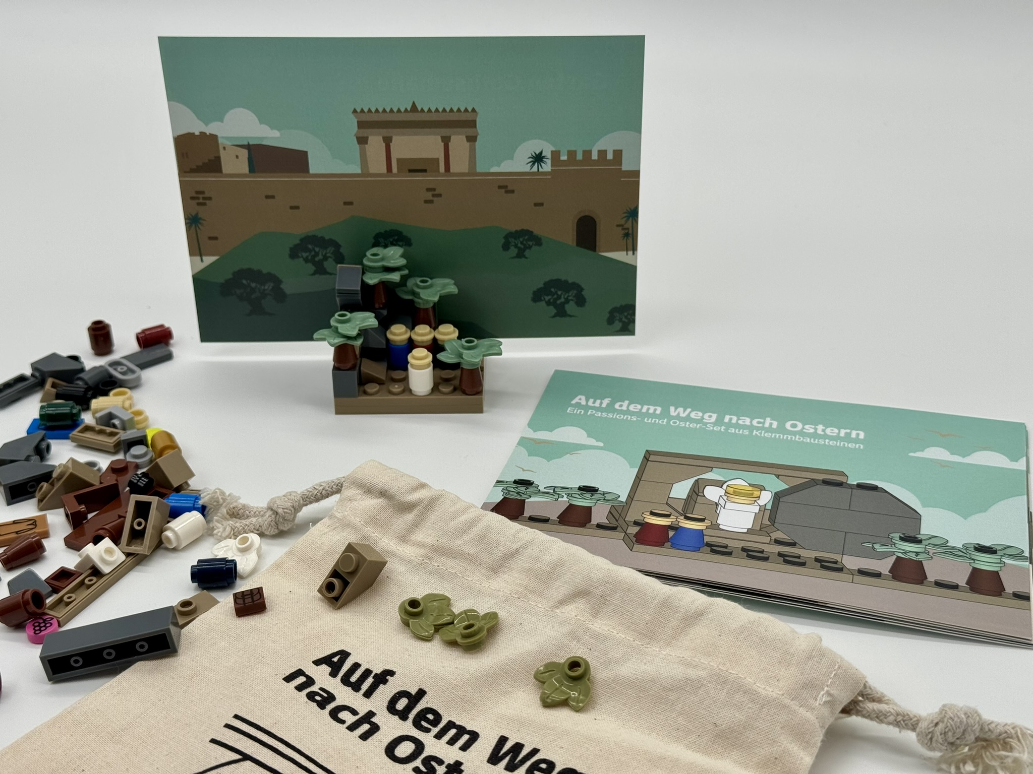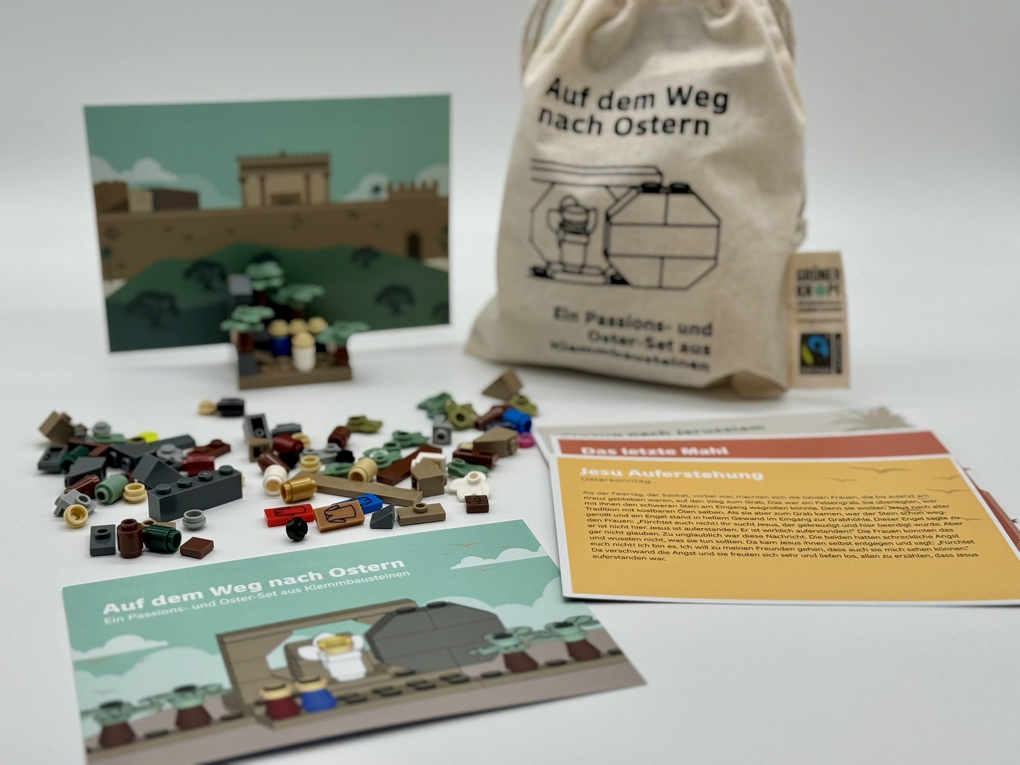 Das innovative Klemmbausteine-Set „Auf dem Weg nach Ostern“ lädt Kinder und Erwachsene ein, die spannende Geschichte von Jesus inhaltlich und spielerisch zu erleben. Von Palmsonntag bis hin zum Ostermontag gibt es an jedem Feiertag ein liebevoll designtes Klemmbaustein-Diorama. So sind die wichtigsten Stationen der Karwoche und das Osterfest erlebbar. Zu jedem Feiertag wird mit den Klemmbausteinen ein Postkartenhalter gebaut. Die hochwertigen Postkarten bieten den kindgerechten Text für die jeweilige Szene und bilden gleichzeitig den Hintergrund zum Klemmbaustein-Bauwerk. Die Stationen sind: der Einzug Jesu nach Jerusalem am Palmsonntag, das letzte Abendmahl am Gründonnerstag, die Gefangennahme im Garten Gethsemane, die Kreuzigung am Karfreitag und schließlich die wunderbare Auferstehung am Ostersonntag und die Emmaus-Jünger:innen am Ostermontag.