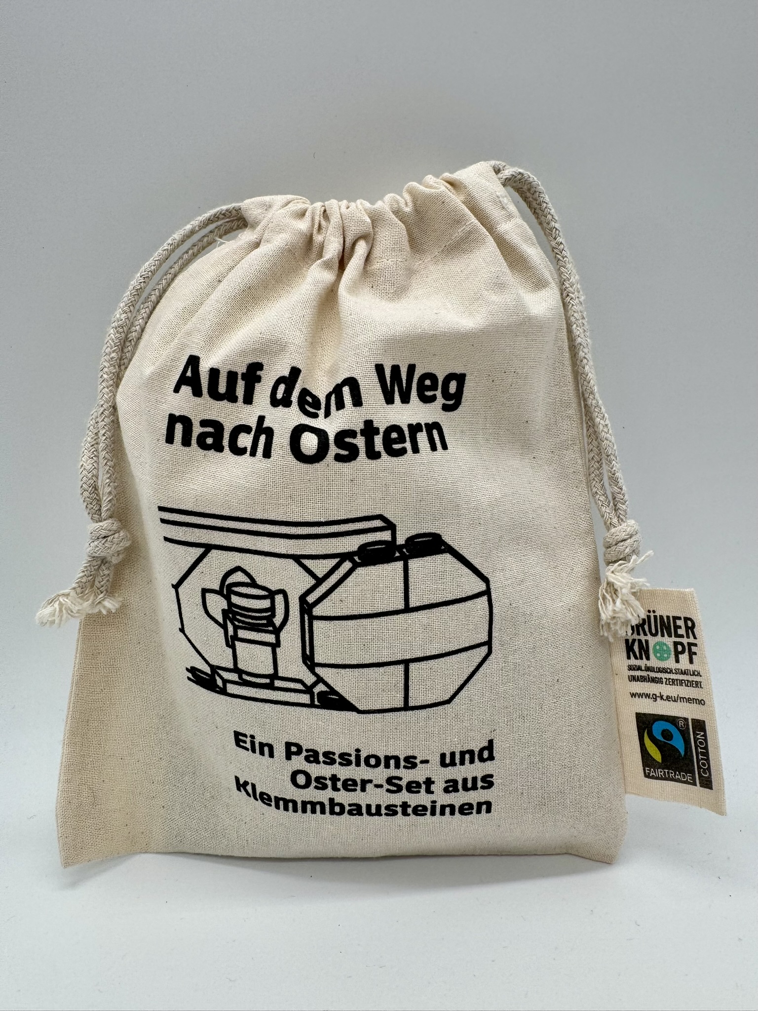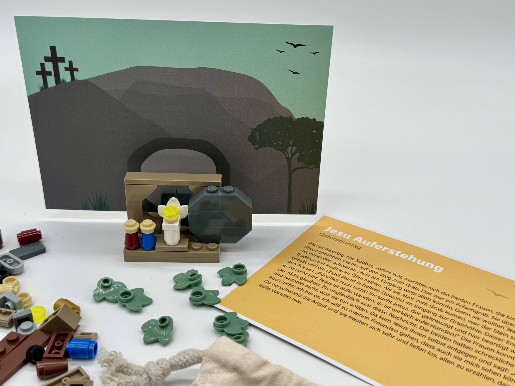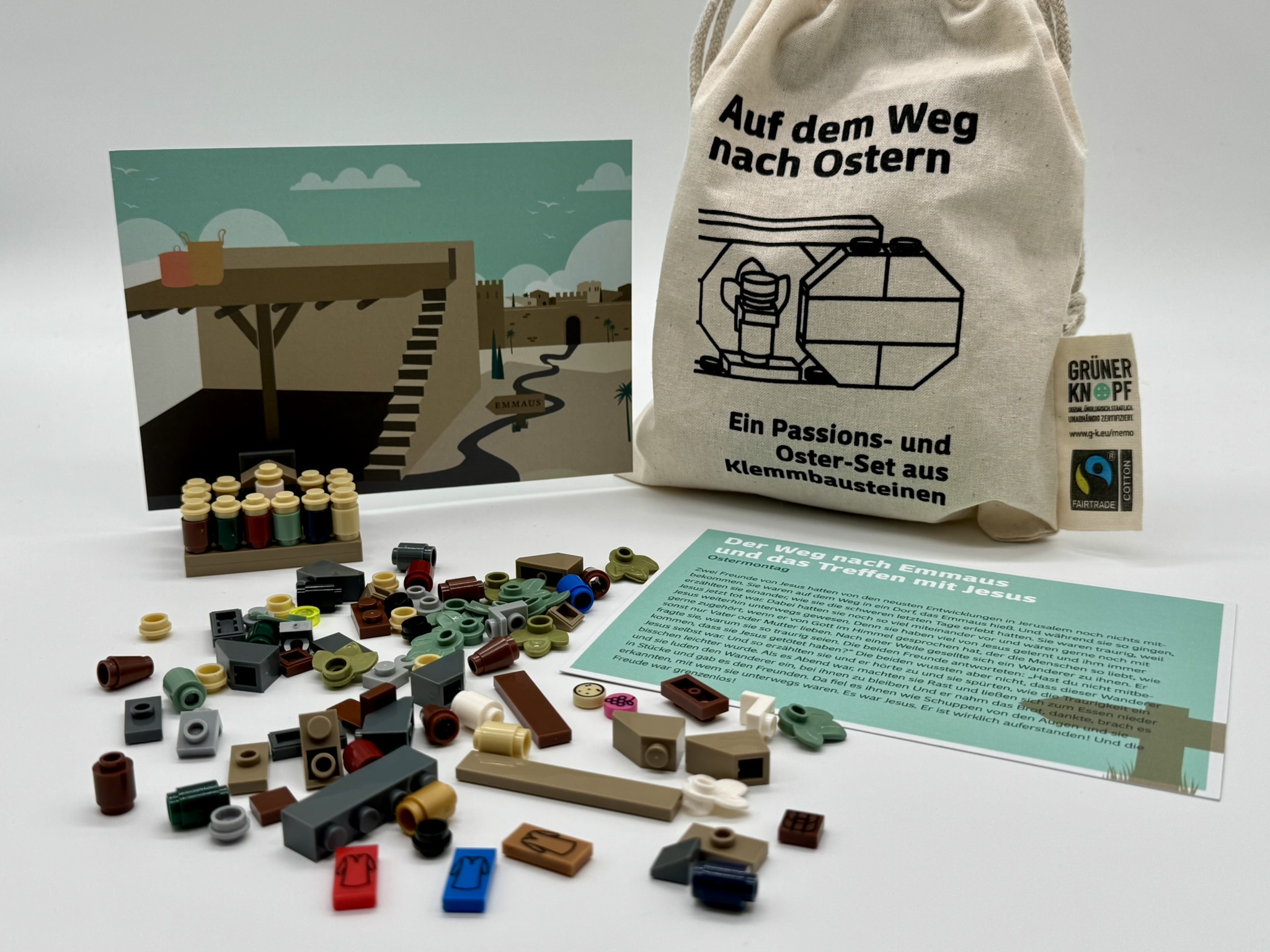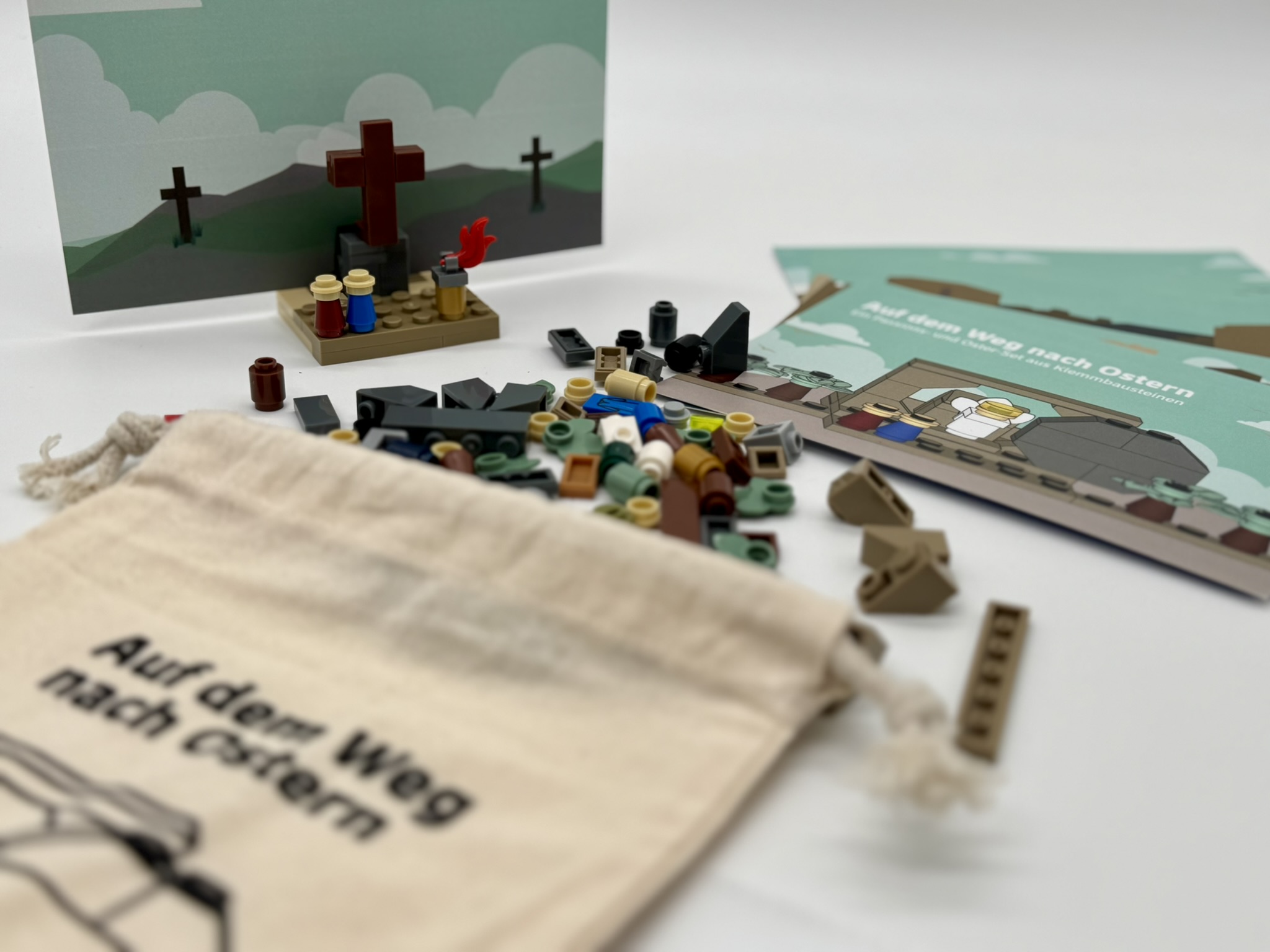 Das innovative Klemmbausteine-Set „Auf dem Weg nach Ostern“ lädt Kinder und Erwachsene ein, die spannende Geschichte von Jesus inhaltlich und spielerisch zu erleben. Von Palmsonntag bis hin zum Ostermontag gibt es an jedem Feiertag ein liebevoll designtes Klemmbaustein-Diorama. So sind die wichtigsten Stationen der Karwoche und das Osterfest erlebbar. Zu jedem Feiertag wird mit den Klemmbausteinen ein Postkartenhalter gebaut. Die hochwertigen Postkarten bieten den kindgerechten Text für die jeweilige Szene und bilden gleichzeitig den Hintergrund zum Klemmbaustein-Bauwerk. Die Stationen sind: der Einzug Jesu nach Jerusalem am Palmsonntag, das letzte Abendmahl am Gründonnerstag, die Gefangennahme im Garten Gethsemane, die Kreuzigung am Karfreitag und schließlich die wunderbare Auferstehung am Ostersonntag und die Emmaus-Jünger:innen am Ostermontag.