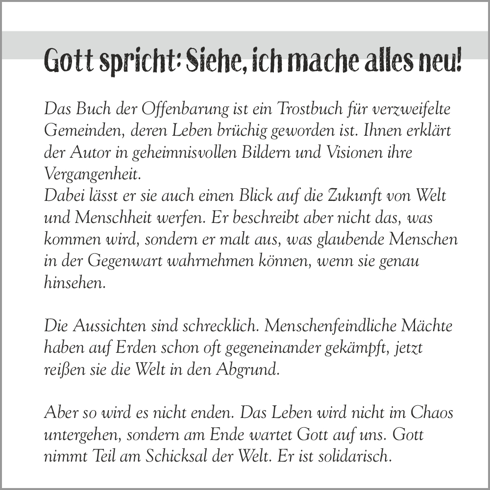 | Leporello zur Jahreslosung 2026 "Gott spricht: Siehe, ich mache alles neu" (Offenbarung 21.5). Kunstvoll bebildert von Bernhard Götz. Mit erläuternden Worten von Veronika Bohnet. Verkaufseinheit 10 Stück.