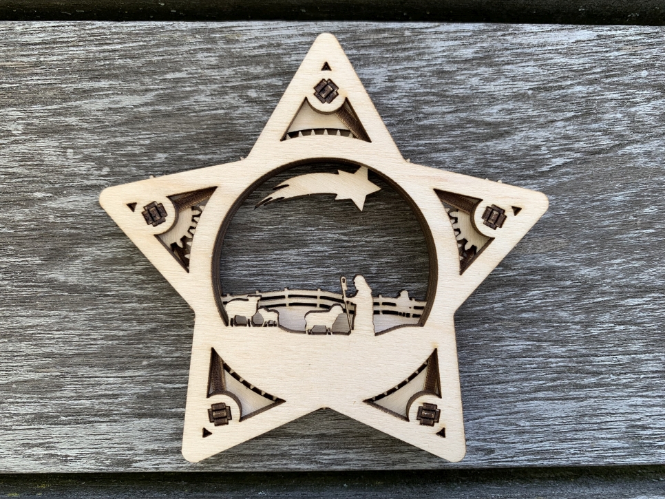 Der dekorative dreilagige Stern aus Birken-Sperrholz überrascht mit einem beweglichen Element. Kleine Zahnräder in den seitlichen Sternspitzen lassen den Kometen durch die Weihnachtsszene wandern. Durchmesser ca. 11 cm