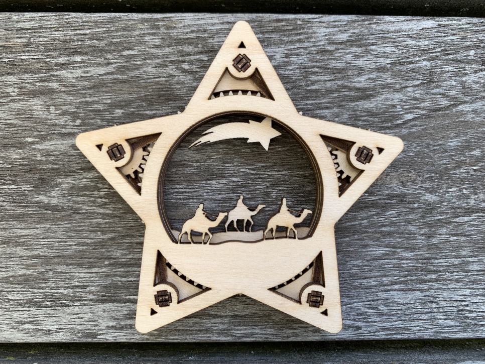 Der dekorative dreilagige Stern aus Birken-Sperrholz überrascht mit einem beweglichen Element. Kleine Zahnräder in den seitlichen Sternspitzen lassen den Kometen durch die Weihnachtsszene wandern. Durchmesser ca. 11 cm